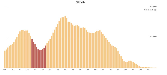 2024年乌克兰东说念主口各年级层区分,不错看到18-27岁群体东说念主数出现理会断层。费力