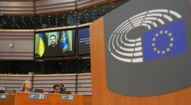 2月24日,比利时布鲁塞尔,泽连斯基就俄乌冲突四周年在欧洲议会发表视频谈话。视觉中国
