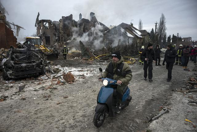 当地时辰2026年2月22日,乌克兰基辅,别称当地住户骑着摩托车经过一处在大鸿沟俄军勤奋中受损的住户区。视觉中国