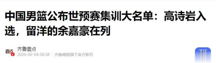 齐鲁壹点——中国男篮公布世预赛集训大名单:高诗岩入选,留洋的余嘉豪在列