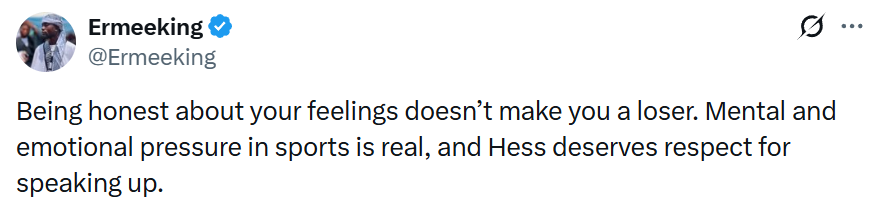 还有网友对赫斯表示支持,“坦诚表达自己的感受并不代表你是个失败者。体育运动中的心理和情感压力是真实存在的,赫斯敢于发声值得尊重。”↓