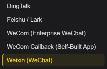 钉钉、飞书、企业微信、企业微信自建专揽回调,加上此次新加的个东谈主微信,一个不落。