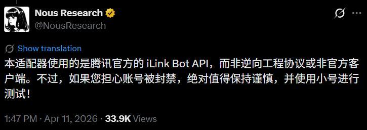 技巧底色这边Nous也叮嘱了一句,用的是腾讯官方的iLink Bot API,不是第三方破解左券或非官方客户端。
