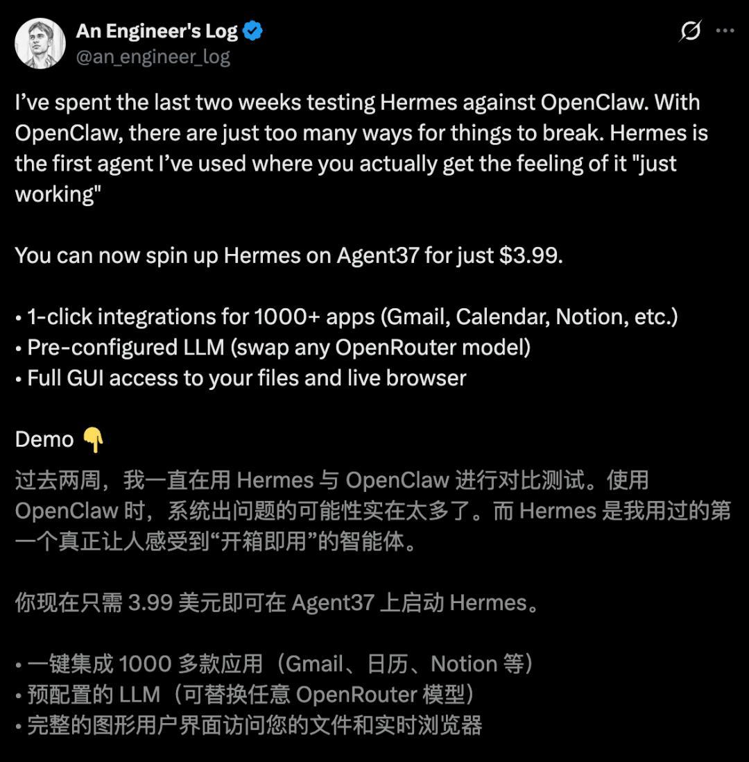 Hermes才是真确让他感受到「开箱即用」的AI Agent,何况仅需3.99好意思元即可用上了。