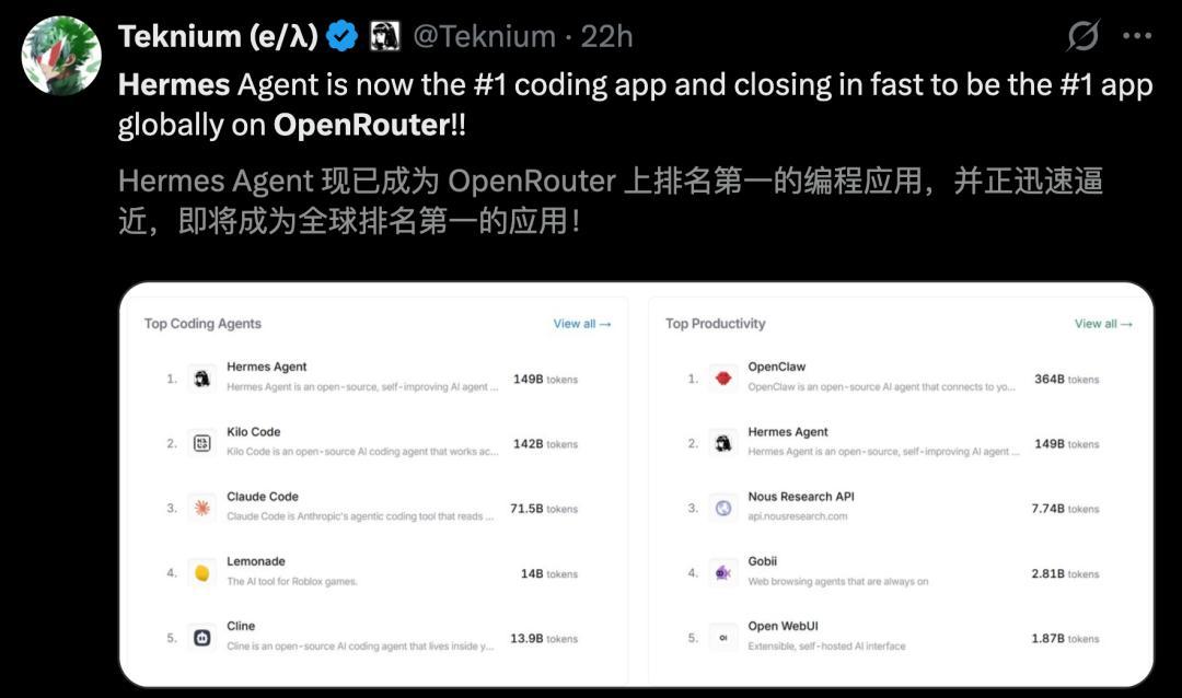 就在今天,Hermes在OpenRouter上的token消费日榜位列第二,仅次于OpenClaw。