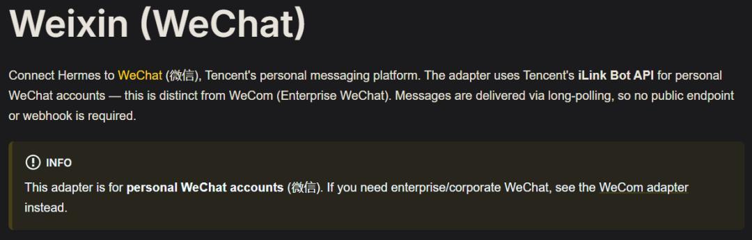 官方文档:https://hermes-agent.nousresearch.com/docs/user-guide/messaging/weixin