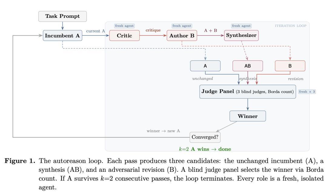 Autoreason的中枢逻辑不再是盲猜度打算「改改改」,而是引入了严谨的竞争与管制机制。