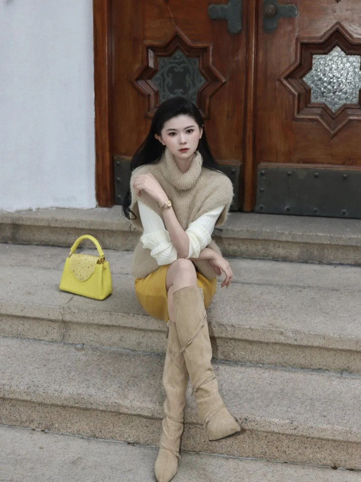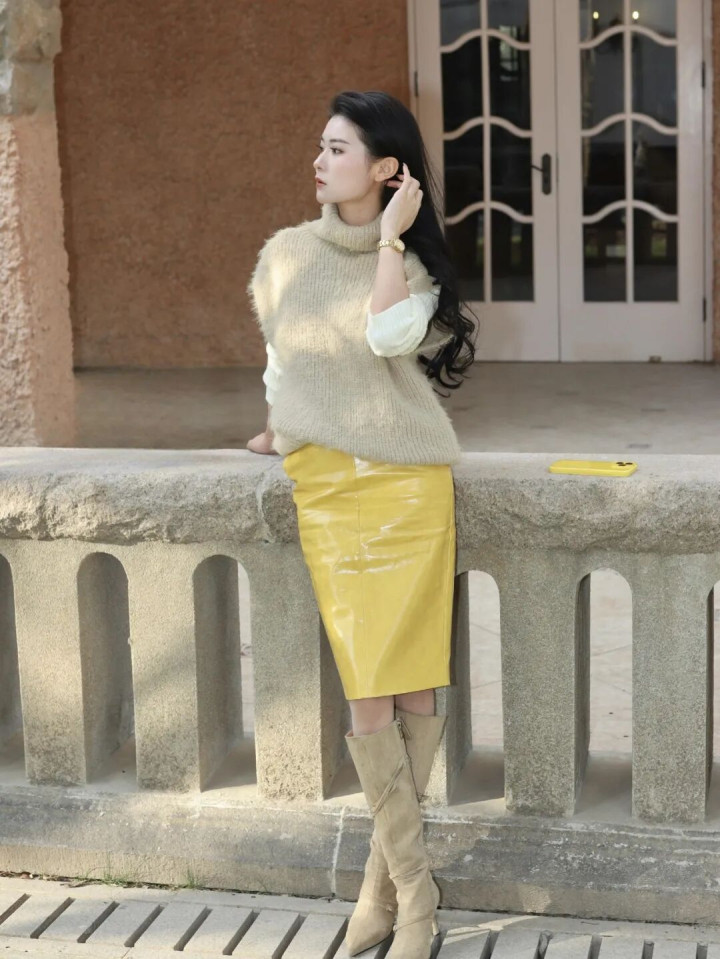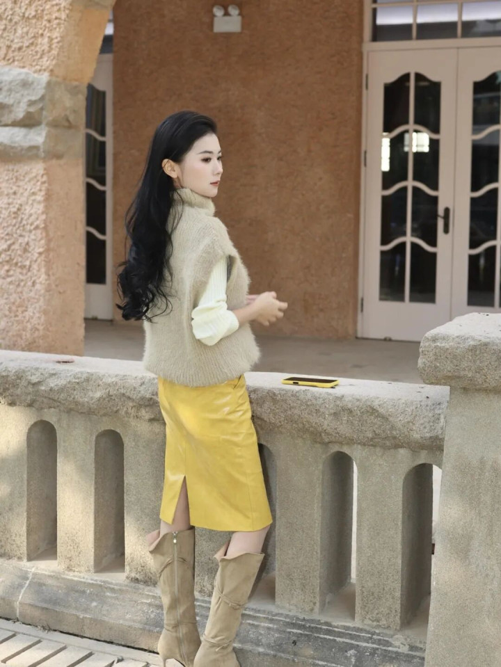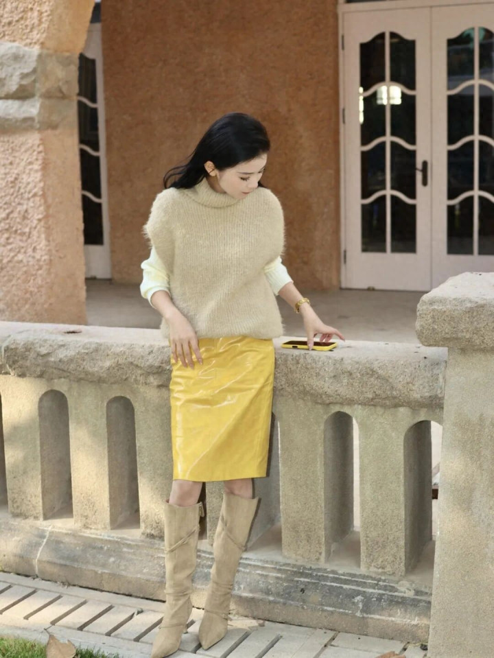 ag百家乐 颜值穿搭: “毛衣叠穿+亮黄皮裙+长靴”