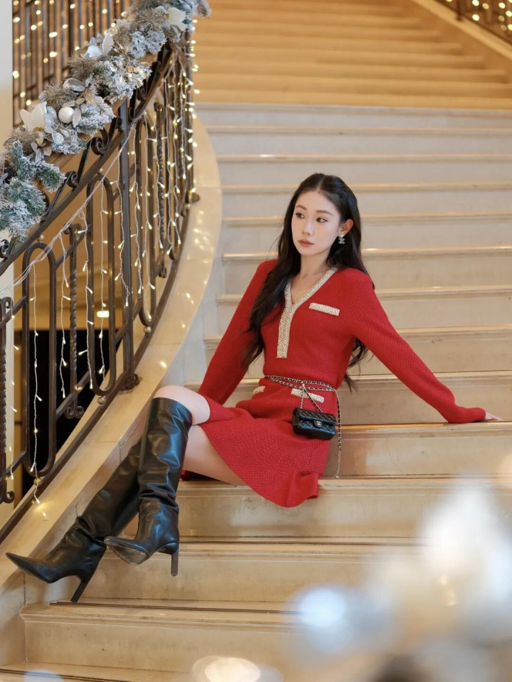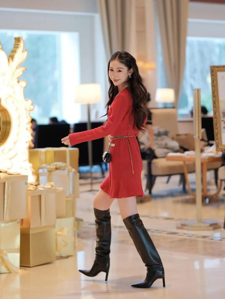 ag百家乐app 小红裙配黑长靴, 经典红黑配就是好看!